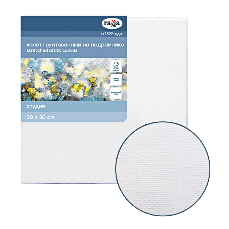 Холст на подрамнике Гамма Студия , 30*30см, 100% хлопок, 280г/м2, мелкое зерно (060220204)описаниеХлопковый холст на подрамнике ГАММА серии «Студия», грунтованный, подойдёт для живописи масляными, акриловыми, темперными и гуашевыми красками. Основа – натуральное полотно, 100% хлопок, мелкое зерно. Холст квадратной формы плотностью 280 г/м2, размер – 30*30 см. Холст покрыт акриловым грунтом, а подрамник выполнен из сосны. Изготовлен без использования кислот.