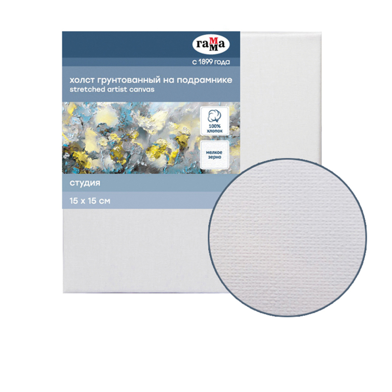 Холст на подрамнике Гамма Студия , 15*15см, 100% хлопок, 280г/м2, мелкое зерно (060220201)описаниеХлопковый холст на подрамнике ГАММА серии «Студия», грунтованный, подойдёт для живописи масляными, акриловыми, темперными и гуашевыми красками. Основа – натуральное полотно, 100% хлопок, мелкое зерно. Холст квадратной формы плотностью 280 г/м2, размер – 15*15 см. Холст покрыт акриловым грунтом, а подрамник выполнен из сосны. Изготовлен без использования кислот.