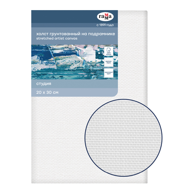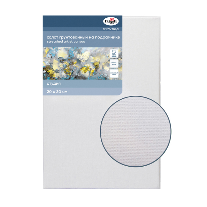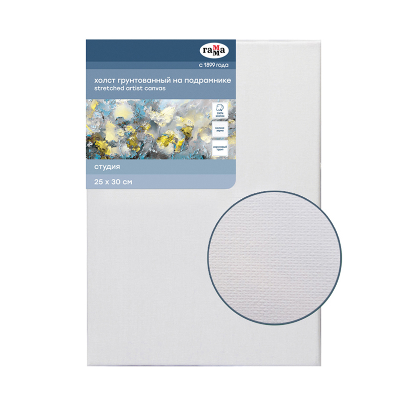 Холст на подрамнике Гамма Студия , 25*30см, 100% хлопок, 280г/м2, мелкое зерно (280818_14)описаниеХлопковый холст на подрамнике ГАММА серии «Студия», грунтованный, подойдёт для живописи масляными, акриловыми, темперными и гуашевыми красками. Основа – натуральное полотно, 100% хлопок, мелкое зерно. Холст прямоугольной формы плотностью 280 г/м2, размер – 25*30 см. Холст покрыт акриловым грунтом, а подрамник выполнен из сосны. Изготовлен без использования кислот.