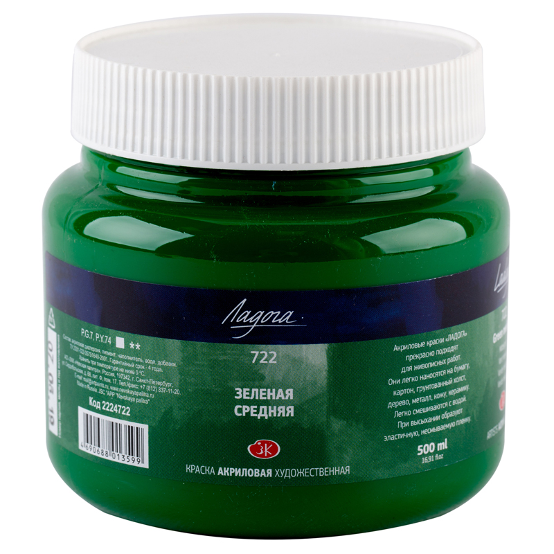 Краска акриловая художественная Ладога, 500мл, банка, зеленая средняя (2224722)описаниеХудожественные акриловые краски «Ладога» производятся на основе качественных пигментов и акриловой