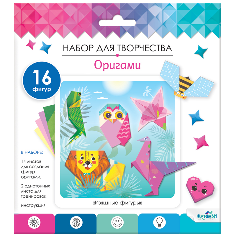 Набор для творчества в технике оригами – это 16 разных фигур, которые сможет сделать каждый легко и просто, без ножниц и клея. В наборе разноцветные листы с яркими узорами для складывания фигур, однотонные листы для тренировки и инструкции. Набор развивает пространственное мышление и мелкую моторику. Купите товар «Набор для творчества Origami Оригами от Оригами. Изящные фигуры (6355)» по оптовой цене с доставкой или самовывозом. Этот товар раскупают быстро. Успевайте! Товар производится под торговой маркой «Оригами», что говорит о высоком качестве продукции.