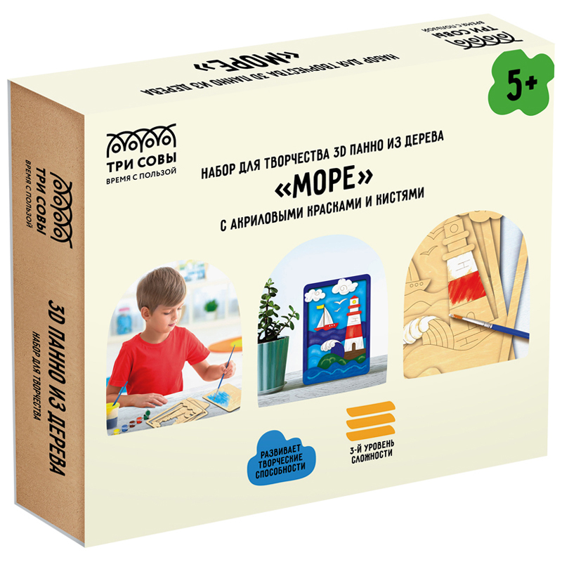 Набор для творчества «ТРИ СОВЫ» для создания 3D-панно из дерева станет отличным подарком. Он поможет развить образное мышление, логику, моторику и творческий потенциал ребенка. Набор «Море» подойдёт для начинающих юных художников и совместного времяпрепровождения детей и их родителей.