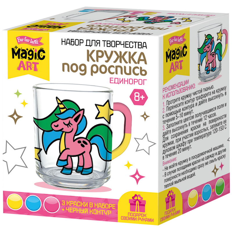 Состав набора: ? стеклянная кружка – 1 шт (высота 9см, диаметр 7см), акриловые краски – 3шт (жёлтая, розовая, голубая), акриловый контур – 1шт, рисунок-трафарет – 1 шт (16*7, 5 см), кисточка – 1 шт (13, 5см). Кружка под роспись «Единорог» помогает развитию творческих способностей ребёнка, мелкой моторики, а также способствует концентрации внимания и художественного вкуса. Срок годности на краски - 36 месяцев, на остальное не ограничен. Купите товар «Набор для детского творчества Десятое королевство Кружка под роспись. Единорог , с красками (4602)» по оптовой цене с доставкой или самовывозом.