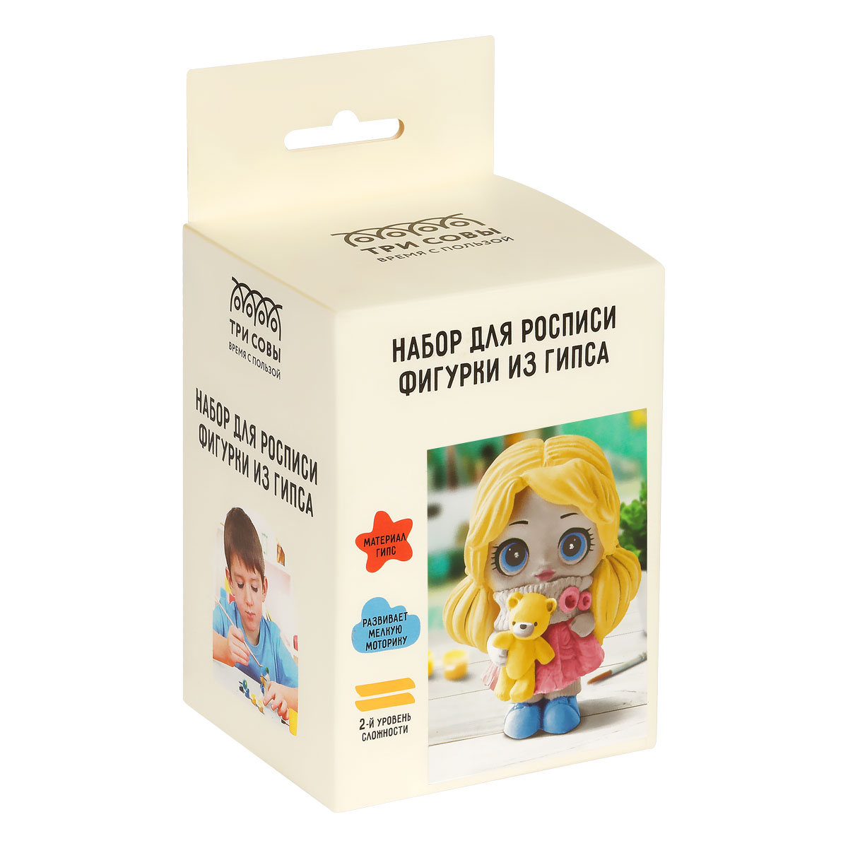 Роспись гипсовых фигурок «ТРИ СОВЫ» – очень простое, увлекательное и полезное занятие для детей, с помощью которого малыш развивает фантазию, точность и аккуратность. В состав набора «Кукла Оля» входит: гипсовая фигурка, краски гуашь, кисточка. В итоге у вас получится фигурка 8, 5 см. Набор упакован в картонную коробку.