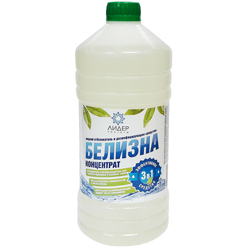 Средство чистящее отбеливающее Лидер Чистоты Белизна концентрат, 3в1 , 1100г (20105)описаниеПреднозначен для мытья и дезинфекций фарфоровой, фаянсовой посуды, стен, потолков, пластика, унитазов, сантехники, других гладких поверхностей, канализационных стоков и прочих мест с повышенной бактериальной активностью, а также для отбеливания и удаления пятен с белых изделий из хлопчатобумажных и льняных тканей.