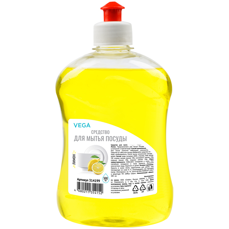 Средство для мытья посуды Vega Лимон , пуш-пул, 500мл (314199)описаниеСредство для мытья посуды. Эффективно удаляет жир и загрязнения с посуды. Состав: вода питьевая (30% и более), ПАВ менее 5%, хлорид натрия (менее 5%), консервант ( менее 5%), отдушка (менее 5%), краситель (менее 5%). Сумма заказа всех товаров с этого склада должна быть не менее 3000 р. Доставка от 4 дней