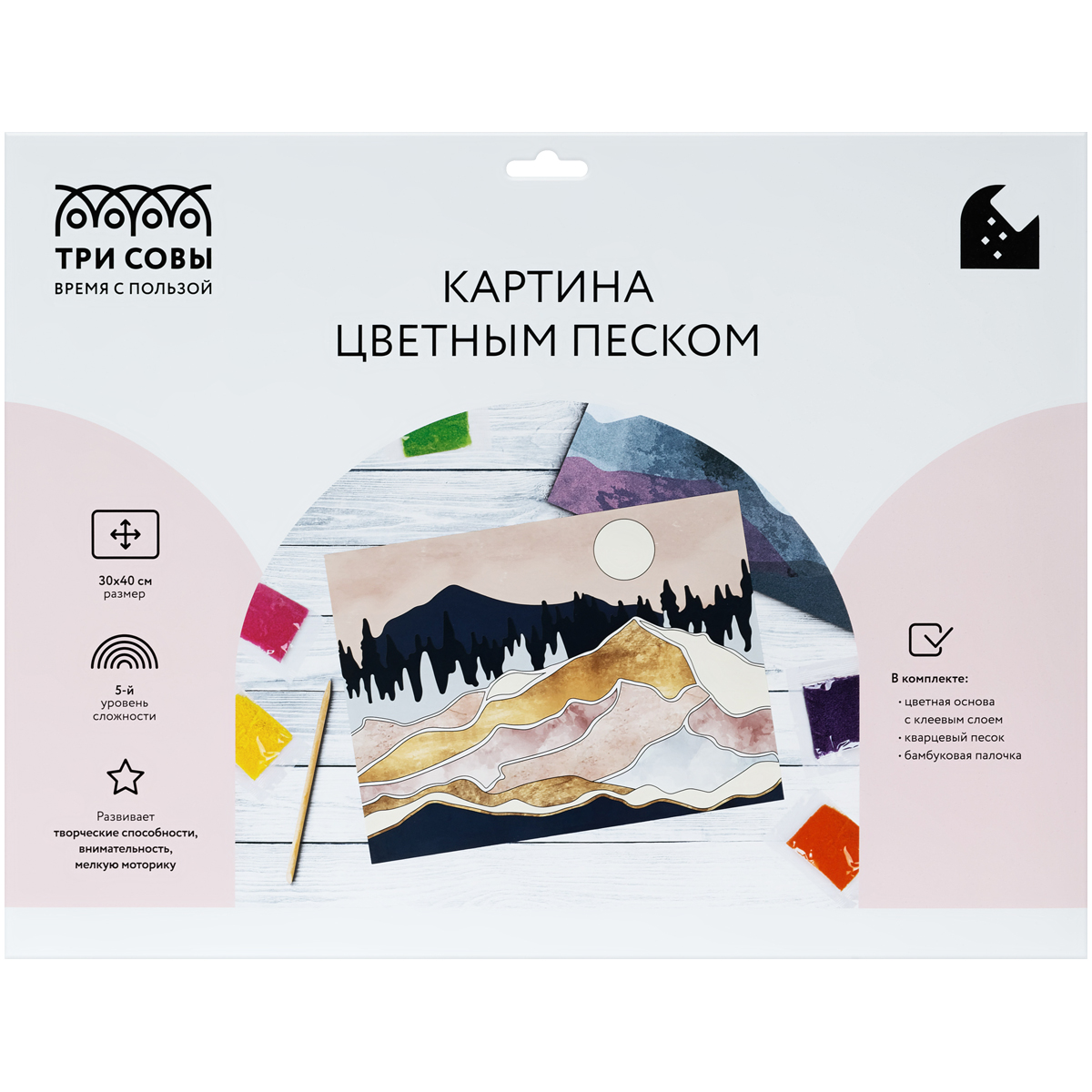 • Тематика: природа. Купите товар «Картина цветным песком ТРИ СОВЫ Полнолуние в горах , картонный пакет с европодвесом (ФП_47869)» по оптовой цене с доставкой или самовывозом.