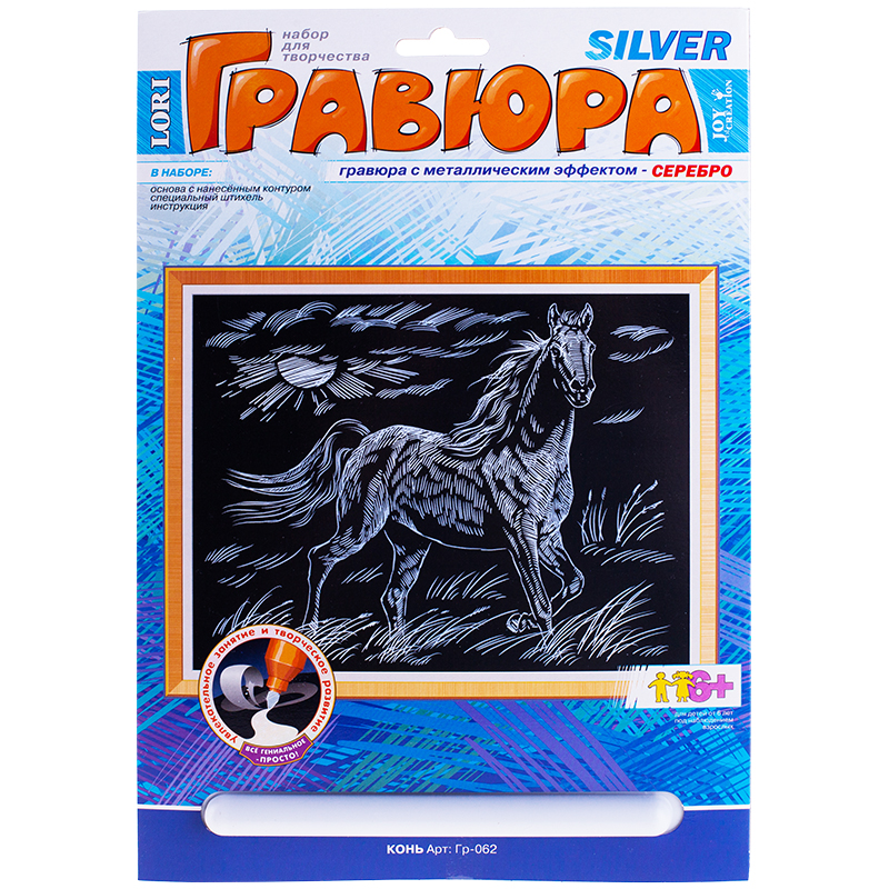 Контур рисунка уже нанесен на черный фон. С помощью специального штихеля изображение процарапывается, и из-под слоя краски появляется золотая основа. В результате получается контрастный рисунок. Комплектация: основа с контуром, штихель, инструкция. Упаковка: картонный пакет с европодвесом. Купите товар «Гравюра с эффектом серебра Lori Конь , 23,5*17,5см (Гр-062)» по оптовой цене с доставкой или самовывозом. Этот товар раскупают быстро. Успевайте! Товар производится под торговой маркой «Lori», что говорит о высоком качестве продукции.