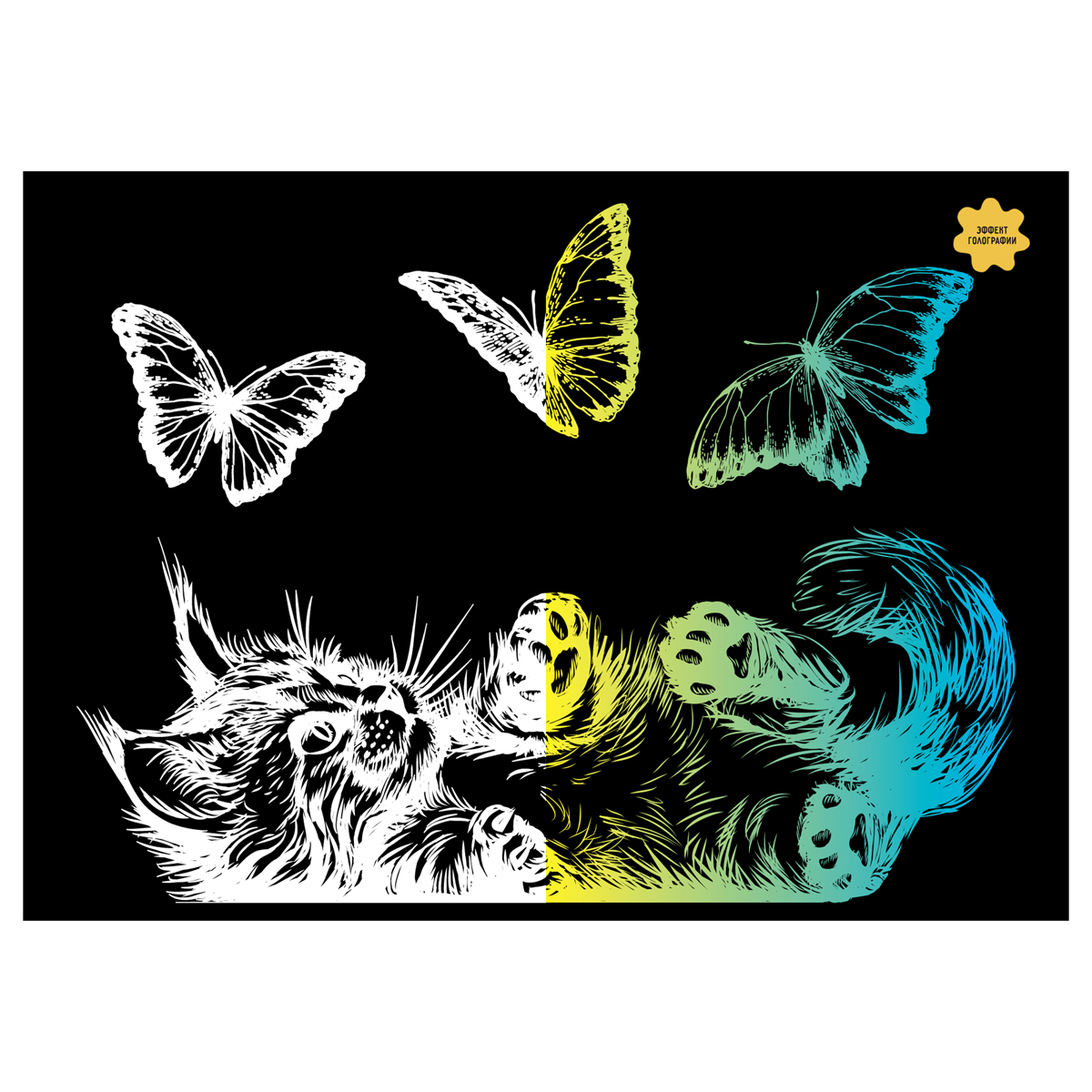 Гравюра с голографическим эффектом ТРИ СОВЫ Кошка и бабочки , А4 (GA4_48288)