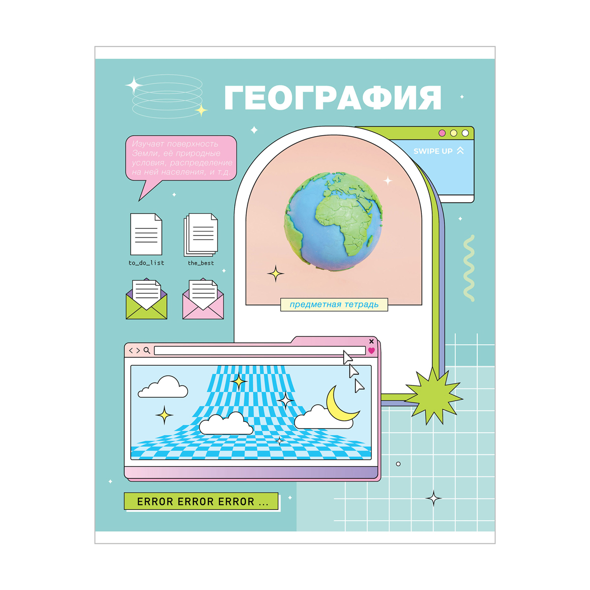 Тетрадь предметная «География» из серии «Пиксель» (в серии 12 предметов), со справочным материалом на обложке. Формат А5, размер – 165*205 мм. Вид крепления – скрепка. Внутренний блок состоит из 48 листов офсетной бумаги плотностью 60 г/м?. Белизна 92%. Линовка – клетка с полями. Обложка выполнена из мелованной бумаги с отделкой ВД-лаком.