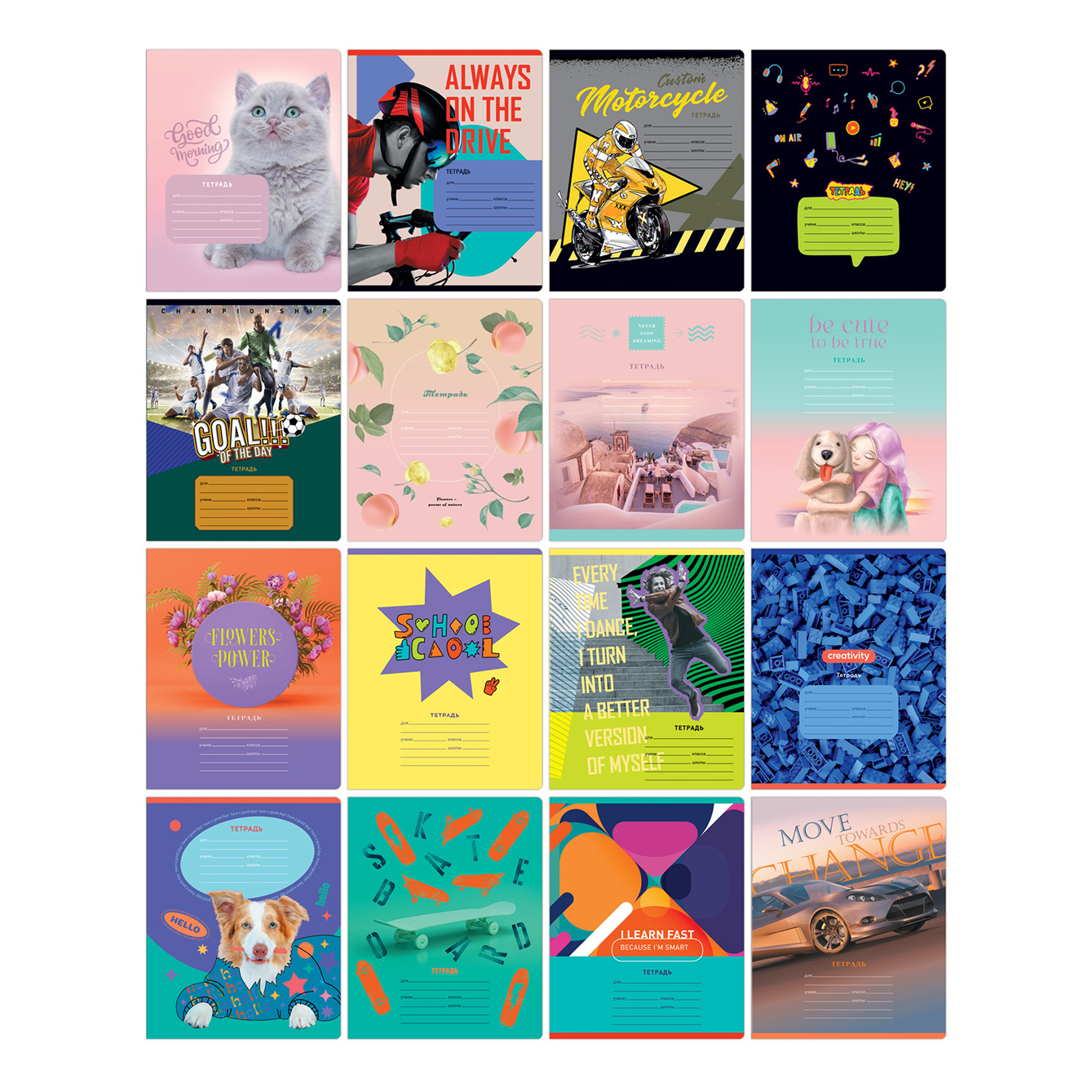 Тетрадь BG серии «Super Mix-16» формата А5 (165*205 мм) на скобе состоит из 12 листов. Внутренний блок – офсетная бумага плотностью 60 г/м?, белизна – 90%, линовка – линия с полями. Обложка тетради изготовлена из мелованного картона. Сзади на обложке размещен Гимн России. Обложка выполнена в 16 креативных дизайнах. Тетради отлично подходят для школьников любого года обучения.