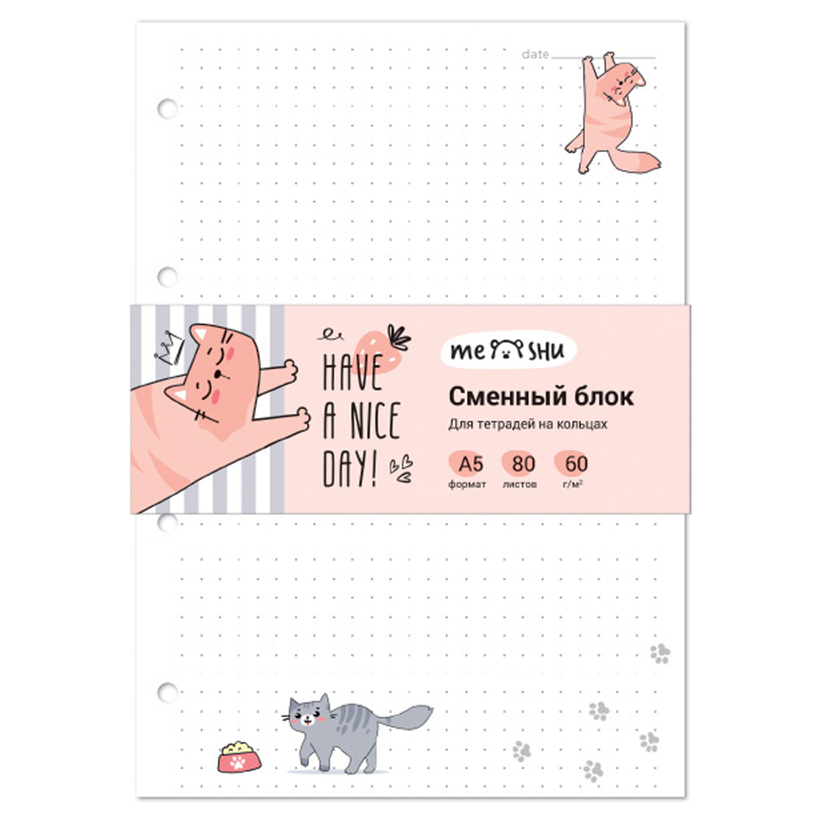 Сменный блок 80л., А5, MESHU Have a nice day , пленка т/у, в точку (MS_48984)описаниеСменный блок для тетрадей с кольцевыми механизмами. Формат А5, 80 листов. Офсетная бумага плотность 60 г/м? в точку, с дизайнерским блоком. Листы скреплены стрип-лентой и так же упакованы в т/у пленку. Цветной дизайн блока и линовка в точку поднимет настроение, и ваша тетрадь станет незаменимым помощником Сумма заказа всех товаров с этого склада должна быть не менее 3000 р. Доставка от 4 дней