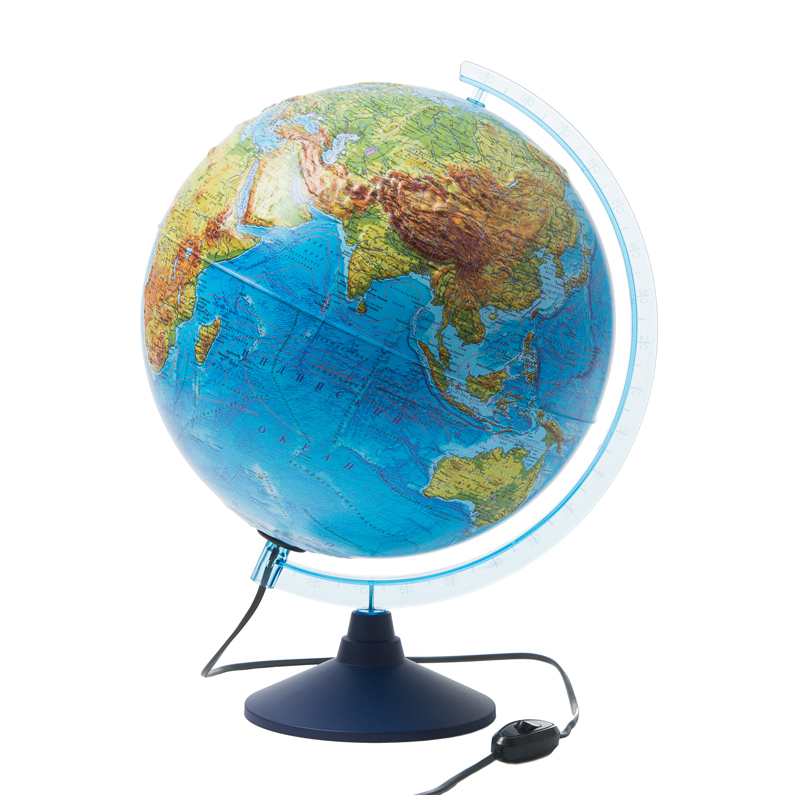 Глобус включает в себя две карты: с выключенной подсветкой вы видите физическую карту мира, при включении подсветки – политическую карту мира. Это делает глобус практичным и долговечным в использовании – пригодится школьнику для изучения окружающего мира, географии, истории и экономики. Так же глобус имеет рельефную поверхность в местах естественных возвышенностей. Эта опция подключает тактильное восприятие, и помогает детям легче запоминать особенности ландшафтного строения Земли. Диаметр глобуса 32 см – достаточно крупный, чтобы использоваться в индивидуальном порядке и для демонстрации в учебных классах. Карта глобуса максимально подробная, все надписи легко читаются. Глобус имеет подсветку от сети, что позволяет комфортно использовать его в темное время суток. Лампочку внутри сферы при необходимости легко заменить. Глобус выполнен из прочного высококачественного пластика с соблюдением всех современных технологий. Упакован в фирменную подарочную коробку. Купите товар «Глобус физико-политический рельефный Globen, 32см, с подсветкой на круглой подставке (Ке013200233)» по оптовой цене с доставкой или самовывозом. Этот товар раскупают быстро. Успевайте! Товар производится под торговой маркой «Globen», что говорит о высоком качестве продукции.
