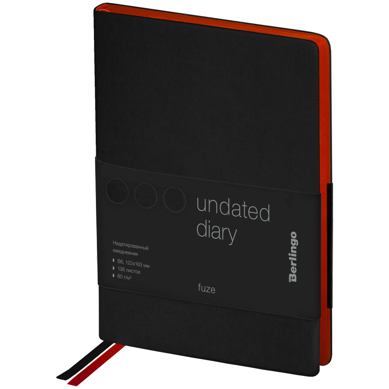 Стильный недатированный ежедневник Berlingo Fuze формата B6 с ультрамягкой обложкой из экокожи. Обложка черного цвета ярко контрастирует с красным срезом. Внутренний блок состоит из 136 листов высококачественной кремовой бумаги повышенной плотности 80 г/м? с пантонной печатью в 2 краски. Недатированный ежедневник Berlingo Fuze представлен в размере 122 на 183 мм.
