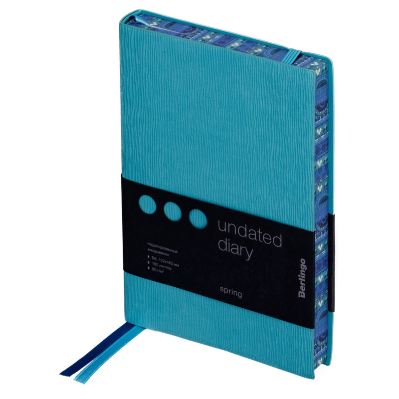 Стильный недатированный ежедневник Berlingo Spring формата B6 с ультрамягкой голубой обложкой из приятного на ощупь материала и фиксирующей резинкой подойдет для ярких заметок. Срез и форзацы ежедневника покрыты полноцветным рисунком. Внутренний блок состоит из 160 листов высококачественной кремовой бумаги повышенной плотности 80 г/м? с пантонной печатью в 2 краски. Недатированный ежедневник Berlingo Spring представлен в размере 143 на 210 мм.