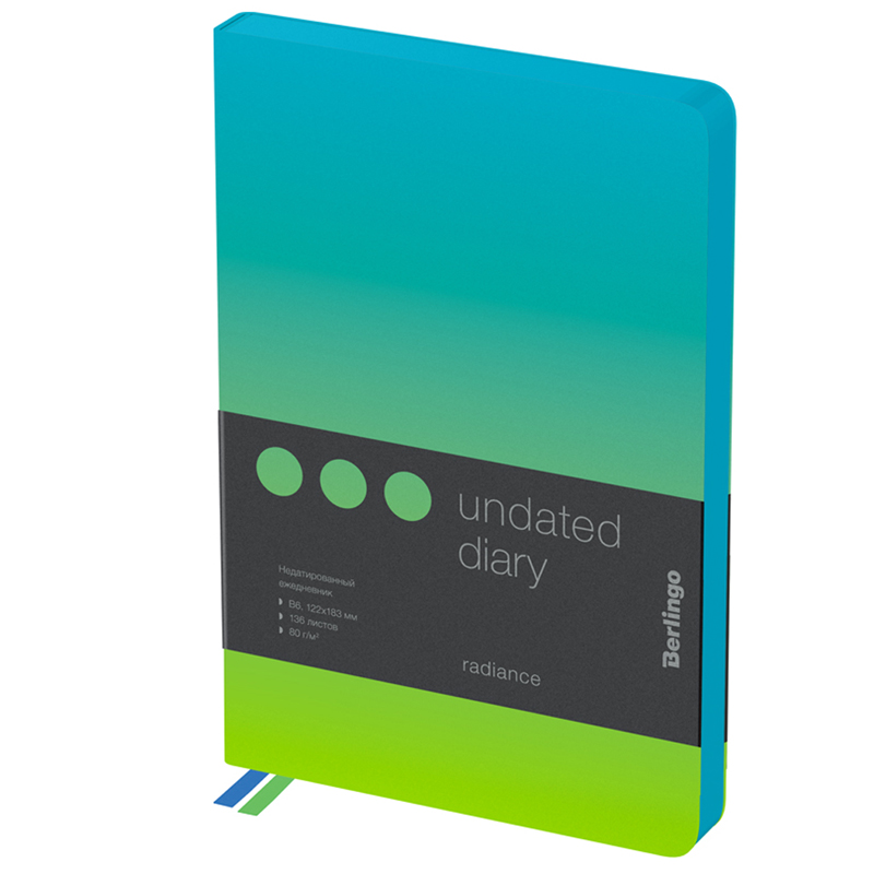 Стильный недатированный ежедневник Berlingo Radiance формата B6 с ярким цветным контрастным срезом и ультрамягкой обложкой из высококачественной экокожи. Насыщенный зелено-голубой градиент стильно сочетается со срезом синего цвета. Внутренний блок состоит из 136 листов высококачественной кремовой бумаги повышенной плотности 80 г/м? с пантонной печатью в 2 краски. Недатированный ежедневник Berlingo Radiance представлен в размере 122 на 183 мм.