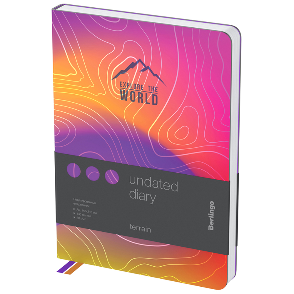 Стильный недатированный ежедневник Berlingo Terrain формата A5 с серебристым фольгированным срезом и ультрамягкой обложкой из высококачественной экокожи. Яркий дизайн коллекционной серии Berlingo Terrain. Внутренний блок состоит из 136 листов высококачественной кремовой бумаги повышенной плотности 80 г/м? с пантонной печатью в 2 краски. Представлен в размере 143 на 210 мм.