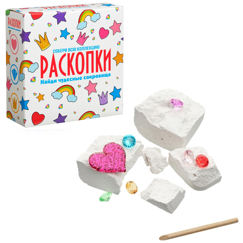 В наборе: деревянный стек для дробления, окаменелый грунт с сокровищами (россыпь разноцветных находок из пластика, фигурная подвеска)