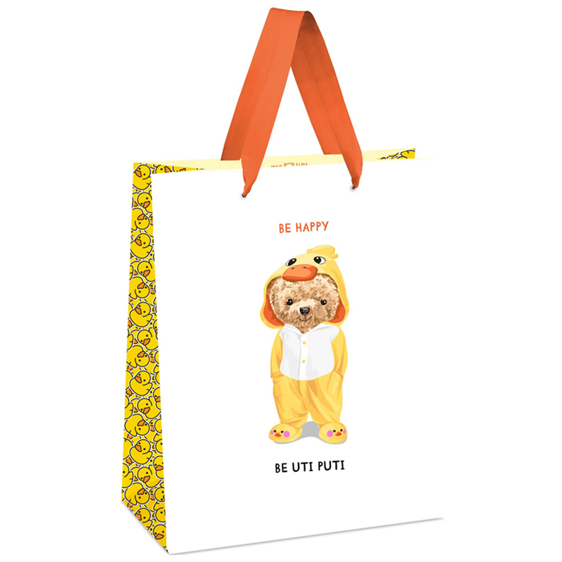 Пакеты MESHU – беспроигрышный способ преподнести подарок красиво. Размер подарочного пакета – 18*23*10 см. Изготовлен из плотного мелованного картона с выборочным лакированием и матовой ламинацией. Пакет MESHU UTI PUTI выполнен в забавном и милом дизайне.