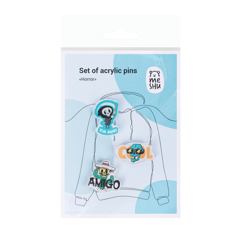 Набор акриловых значков MESHU Horror – оригинальный и модный аксессуар, который преобразит любую вещь. В наборе 3 значка размером – 2, 5*3, 5, 3, 2*3, 3, 5*2 см. Крепление – булавка позволяет значку надёжно держаться.