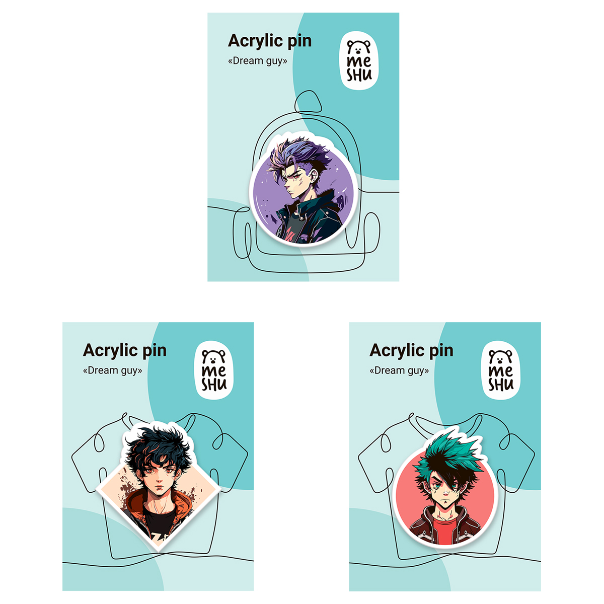 Набор акриловых значков MESHU "Dream guys" поможет украсить худи, джинсовку, косуху или рюкзак, придав вещи индивидуальности. В набор входят три аксессуара, которые сочетаются между собой. Рисунок нанесён на основу при помощи прямой УФ-печати, благодаря чему изображение получается чётким и износостойким. В отличие от изделий, где используется наклейка, покрытие на значках MESHU не начнёт отходить со временем.