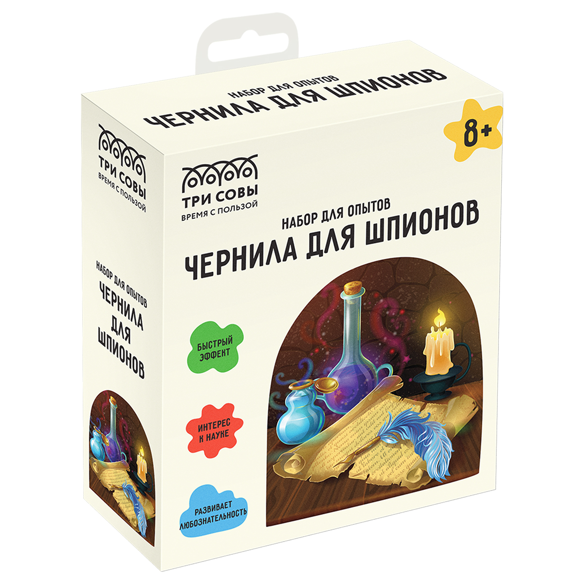 Набор для проведения опытов ТРИ СОВЫ Чернила для шпионов , картонная коробка, европодвес (EX175T)описаниеНабор для опытов «ТРИ СОВЫ» познакомит ребенка с химическими и физическими законами, разовьёт любознательность, позволит самостоятельно провести первый научный эксперимент дома!