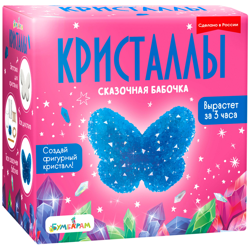 Набор для выращивания кристаллов Бумбарам Фигурный кристалл. Бабочка синяя (A126)описаниеВыращивание кристаллов - это отличная возможность не только понаблюдать за чудесами окружающего мира, но и сотворить их самому! С набором Кристаллы Сказочная бабочка вы сможете изготовить сияющий фигурный кристалл в форме синей бабочки. Кристальная фигурка станет как отличным украшением для комнаты, так и необычным подарком. В заготовке есть специальное отверстие, поэтому готовым кристаллом можно будет украсить комнату или повесить его на елку.