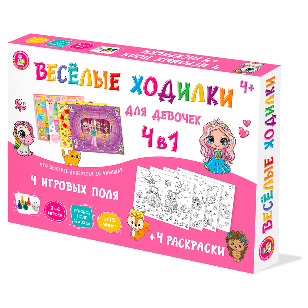 Игра настольная ходилка-раскраска Десятое королевство Веселые ходилки 4 в 1 для девочек, картонная коробка (4946)