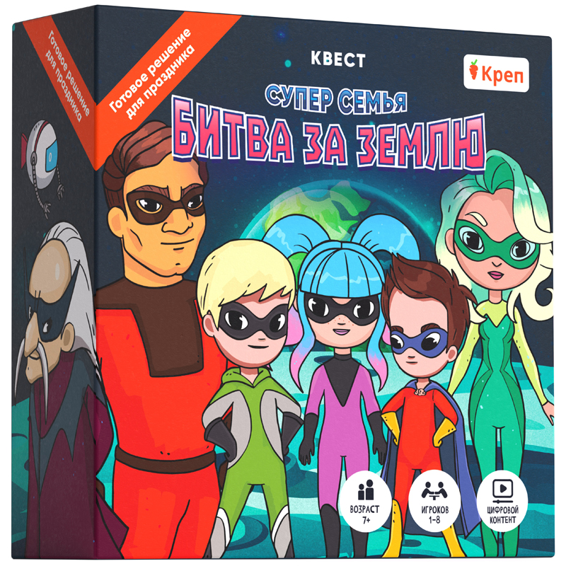 Квест Креп Суперсемья. Битва за землю , картонная коробка (БГ-022)описаниеКвест-приключение, в котором игроки испытать себя и свои сверхспособности.