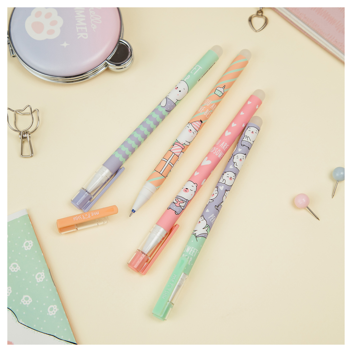 Ручка гелевая стираемая MESHU Kawaii синяя, 0,5мм, корпус ассорти, софт-тач (MS_53943)описаниеГелевая ручка MESHU – это яркий дизайн с уникальными стираемыми чернилами внутри. Диаметр игольчатого пишущего узла – 0,5 мм, благодаря чему получается тонкая и аккуратная линия. Длина сменного стержня 129 мм. Гелевые чернила синего цвета не только ярко пишут на бумаге, но и при воздействии температуры становятся невидимыми. Достаточно потереть написанное ластиком на кончике ручки. Обесцвеченные чернила проявляются при низкой температуре. Благодаря колпачку с клипом можно закрепить ручку на одеж ... [Подробнее на странице товара]Сумма заказа всех товаров с этого склада должна быть не менее 3000 р. Доставка от 4 дней