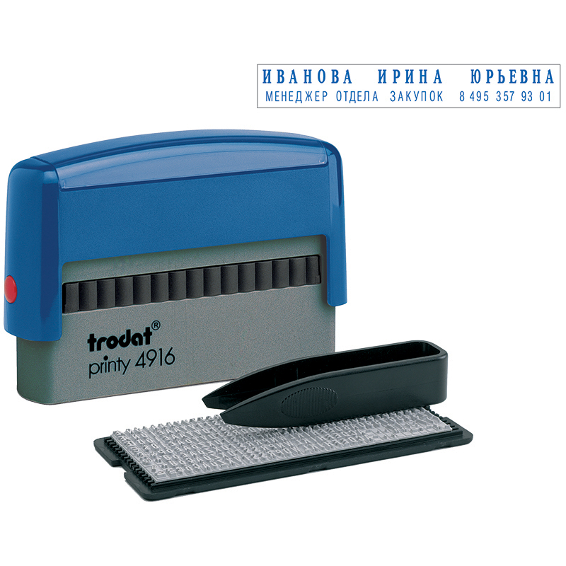 Штамп самонаборный Trodat, 4стр., 2 кассы, пластик, 47*18мм (43210) (4912/DВ)описание4912 P3/DB – 4-строчный самонаборный штамп. В комплект входит пинцет, 2 кассы букв, цифр и символов 6005 и 6006. Максимальное количество знаков в строке основного шрифта – 28, для выделения текста – 19. Сумма заказа всех товаров с этого склада должна быть не менее 3000 р. Доставка от 4 дней