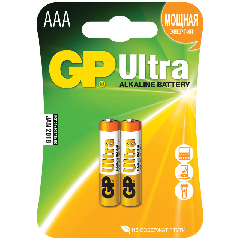 Батарейка GP Ultra AAA (LR03) 24AU алкалиновая, BC2 (GP 24AU-CR2)описаниеЭлементы питания GP 24AU-CR2 Ultra Alkaline с улучшенной марганцево-цинковой системой и щелочным электролитом. При их производстве не используются кадмий и ртуть. Емкость в несколько раз больше, чем у солевых, а срок их хранения — 10 лет.
