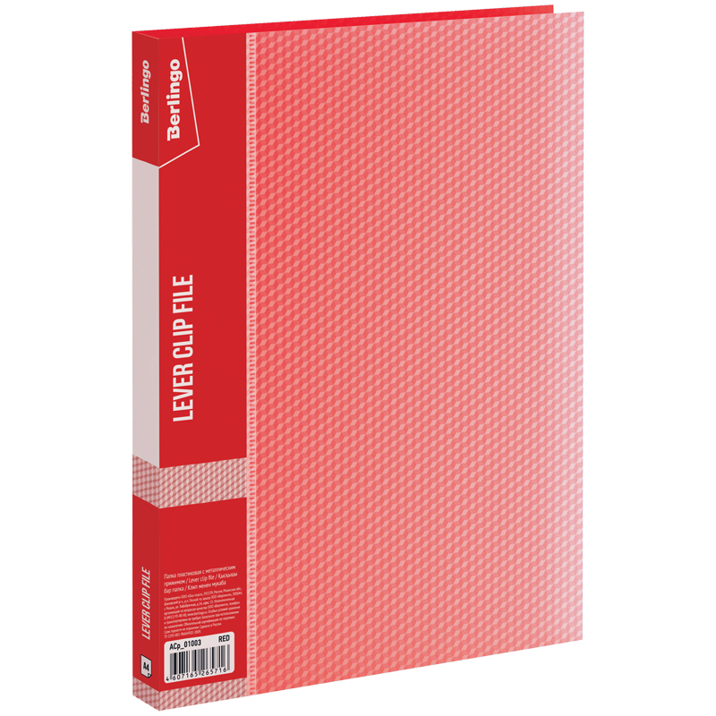 Папка с зажимом Berlingo Diamond , 17мм, 700мкм, красная (ACp_01003)описаниеСтильная папка с металлическим прижимным механизмом Berlingo серии Diamond формата А4 отлично подходит для бережного хранения документов и защищает их от пыли. Ширина корешка - 17 мм. Папка с зажимом вмещает до 100 листов. Выполнена в полупрозрачном красном цвете. Она изготовлена из качественного плотного фактурного пластика толщиной 0,7 мм. Металлический зажим надёжно фиксирует документы, не повреждая их. Папка имеет этикетку на корешке для маркировки. Папка выполнена в размерах: 350*235*17 мм. ... [Подробнее на странице товара]Сумма заказа всех товаров с этого склада должна быть не менее 3000 р. Доставка от 4 дней