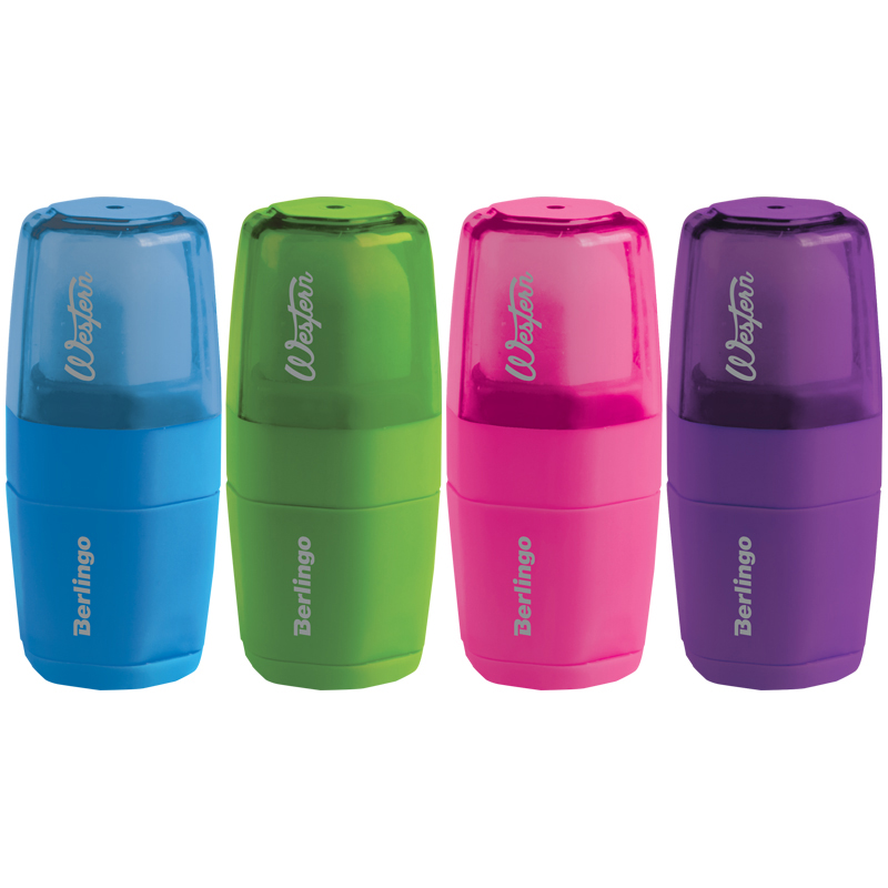 Ластик + точилка Berlingo 2 в 1. С одной стороны конструкции находится ластик, выполненный из высококачественной термопластичной резины, а точилка и контейнер для стружки с другой стороны. Позволяет производить заточку карандашей стандартного диаметра до 8 мм. Упаковка в дисплей. Каждый ластик имеет штрихкод. 4 цвета ассорти. Купите товар «Точилка пластиковая с ластиком Berlingo Western 1 отверстие, контейнер, ассорти (BLc_00140)» по оптовой цене с доставкой или самовывозом.