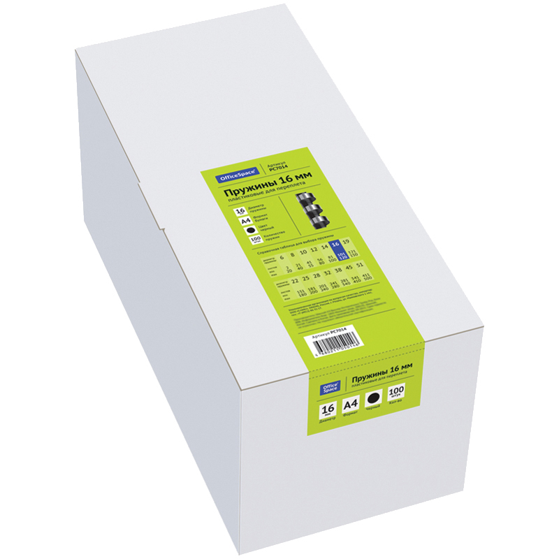 Главная страницаБрошюровщики и расходные материалы для переплетаПружины для переплетаОфисная техникаУдалённый склад 2Пружины для переплета пластиковые → Пружины пластик D=16мм OfficeSpace, черный, 100шт. (PC7014)