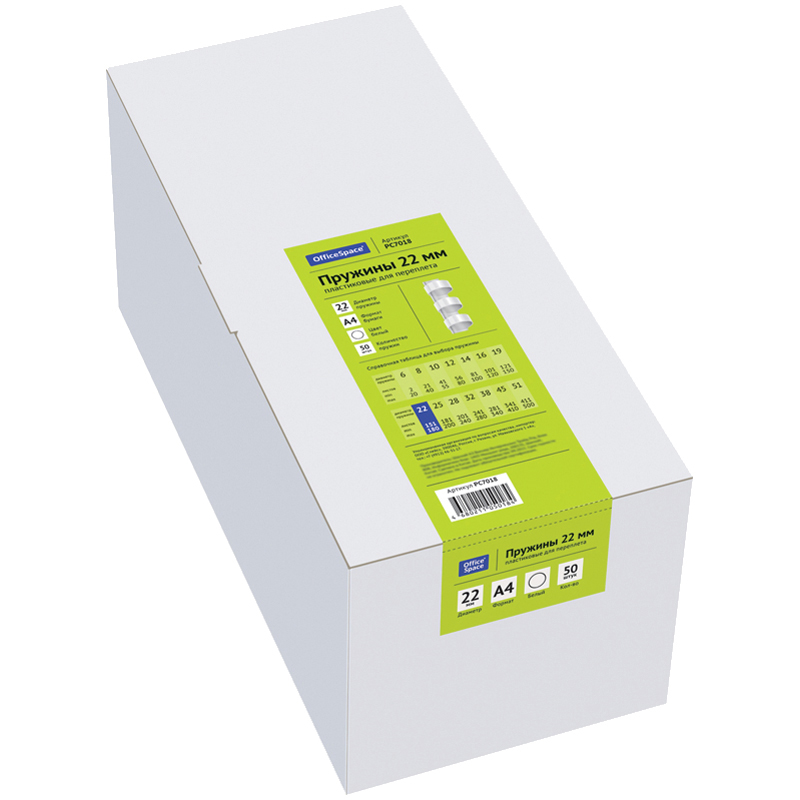Пластиковые пружины OfficeSpace белого цвета диаметром 22мм предназначены для переплета документов. Легко выдерживают многократное раскрытие при необходимости добавить или удалить листы из готовой брошюры. Рекомендуемый объем брошюры при использовании данного диаметра пружины: 151-180 листов. Купите товар «Пружины пластик D=22мм OfficeSpace, белый, 50шт. (PC7018)» по оптовой цене с доставкой или самовывозом.