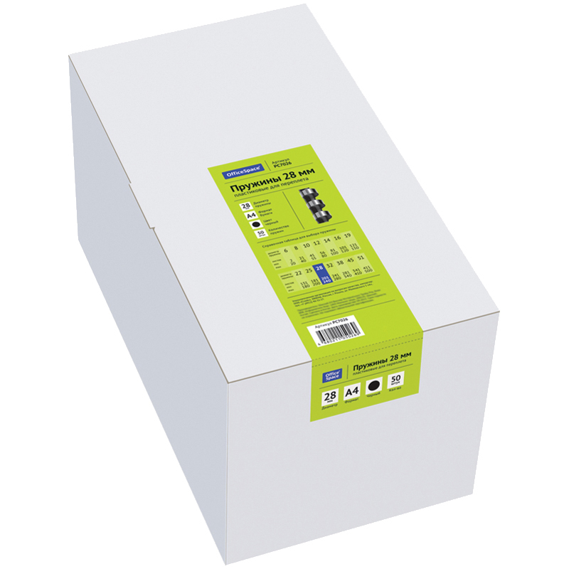Пружины пластик D=28мм OfficeSpace, черный, 50шт. (PC7026)описаниеПластиковые пружины OfficeSpace черного цвета диаметром 28мм предназначены для переплета документов. Легко выдерживают многократное раскрытие при необходимости добавить или удалить листы из готовой брошюры. Рекомендуемый объем брошюры при использовании данного диаметра пружины: 201-240 листов. Сумма заказа всех товаров с этого склада должна быть не менее 3000 р. Доставка от 4 дней