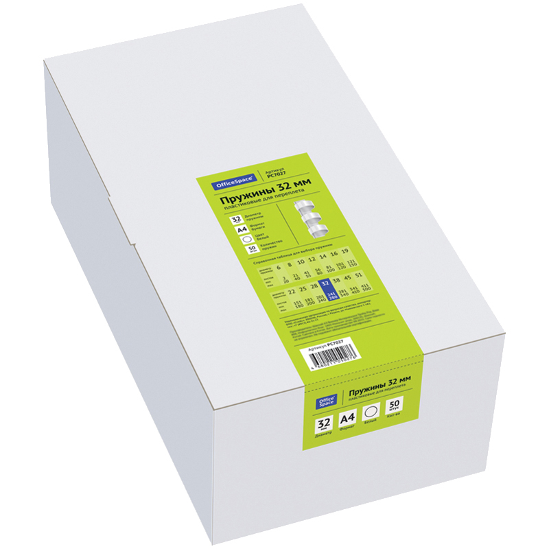 Пружины пластик D=32мм OfficeSpace, белый, 50шт. (PC7027)описаниеПластиковые пружины OfficeSpace белого цвета диаметром 32мм предназначены для переплета документов. Легко выдерживают многократное раскрытие при необходимости добавить или удалить листы из готовой брошюры. Для надежной фиксации листов брошюры в пружине предусмотрены специальные блокирующие замки. Рекомендуемый объем брошюры при использовании данного диаметра пружины: 241-280 листов. Сумма заказа всех товаров с этого склада должна быть не менее 3000 р. Доставка от 4 дней