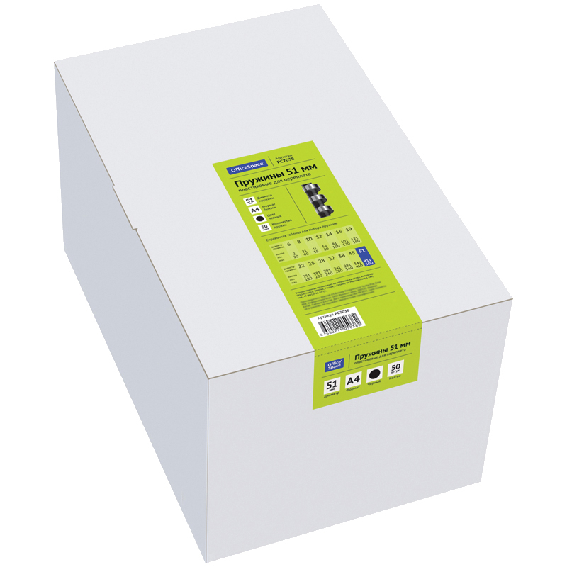 Пружины пластик D=51мм OfficeSpace, белый, 50шт. (PC7036)описаниеПластиковые пружины OfficeSpace белого цвета диаметром 51мм предназначены для переплета документов. Легко выдерживают многократное раскрытие при необходимости добавить или удалить листы из готовой брошюры. Для надежной фиксации листов брошюры в пружине предусмотрены специальные блокирующие замки. Рекомендуемый объем брошюры при использовании данного диаметра пружины: 411-500 листов. Сумма заказа всех товаров с этого склада должна быть не менее 3000 р. Доставка от 4 дней