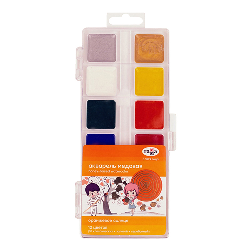 Акварель Гамма Оранжевое солнце , медовая, 12 цветов (10 классич.+золото+серебро), без кисти, пластик. упак., европодвес (291020210)