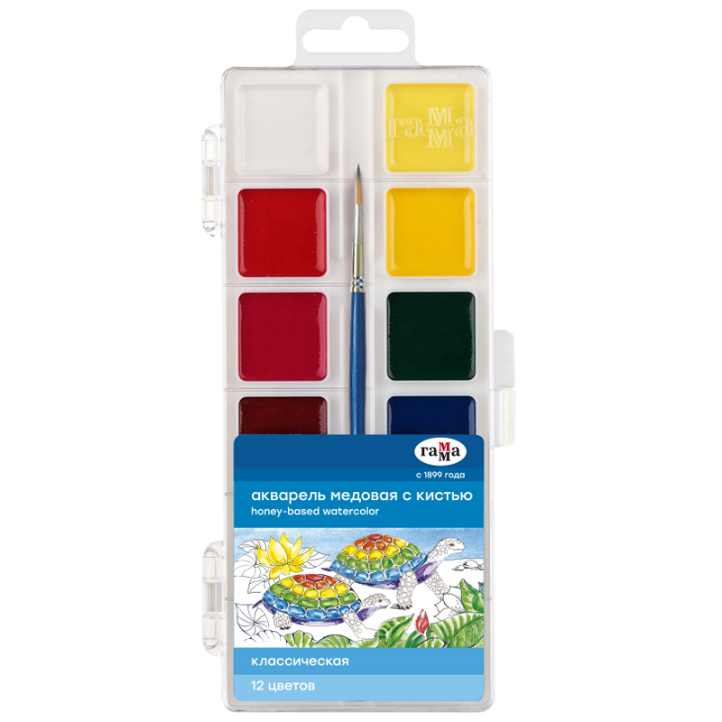 Акварель Гамма Классическая , медовая, 12 цветов, без кисти, пластик. упак., европодвес NEW (1009194)описаниеМедовая полусухая акварель серии Классическая разработана для использования в школе и дома.