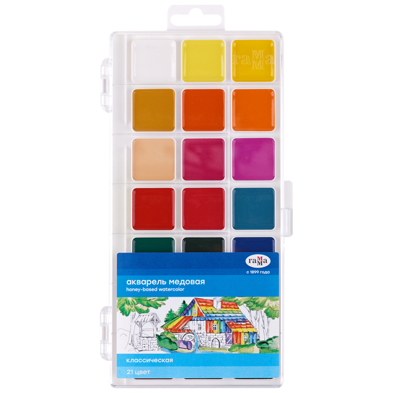 Акварель Гамма Классическая , медовая, 21 цвет, без кисти, пластик. упак., европодвес NEW (1009197)описаниеМедовая полусухая акварель ГАММА серии «Классическая» разработана для творческих занятий в школе и дома. Естественные цвета акварели обучают правильному цветовосприятию окружающего мира. Краски изготовлены на основе органических пигментов и натурального связующего. Прозрачность красок, яркость и чистота цвета, разносимость и размываемость — основные характеристики акварели серии «Классическая». Удобный пластиковый пенал: палитра для смешивания красок расположена на крышке, а кюветы с высокими бо ... [Подробнее на странице товара]Сумма заказа всех товаров с этого склада должна быть не менее 3000 р. Доставка от 4 дней