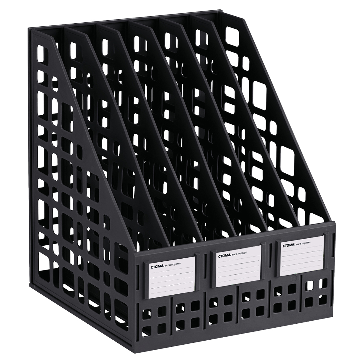 Лоток сборный 6 отделений для бумаг формата А4. Современный дизайн, быстрая и легкая сборка. Удобная конструкция предусматривает регулировку ширины отделений. Изготовлен из качественного полистирола. Передняя стенка имеет окна для маркировки, предусматривающие возможность смены вкладышей. Упакован в термоусадочную пленку, поставляется в разобранном виде. Инструкция по сборке в комплекте. Цвет лотка - черный. Купите товар «Лоток для бумаг вертикальный СТАММ, сборный, 6 отделений, черный (ЛТВ-63726/ЛТ87)» по оптовой цене с доставкой или самовывозом.