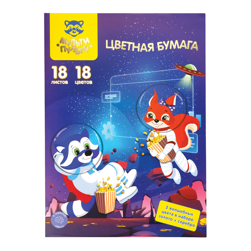 Цветная бумага офсетная А4, Мульти-Пульти, 18л., 18цв., в папке, Енот в космосе. Волшебная (БЦо18-18_37618)описаниеНабор цветной офсетной бумаги «Мульти-Пульти» серии «Енот в космосе. Волшебная» замечательно подойдет для творчества. Бумага имеет размер 200*280 мм. Плотность бумаги формата А4 – 65 г/м2. В наборе представлено 18 цветов офсетной цветной бумаги на 18 листах, в том числе два листа серебряного и золотого цвета, что позволит создавать волшебные фантазийные поделки.