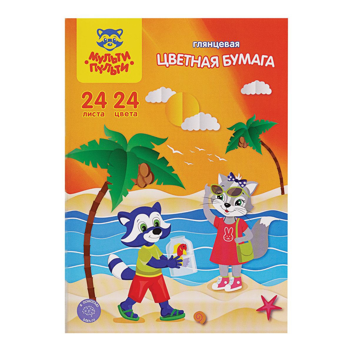 Цветная бумага мелованная А4, Мульти-Пульти, 24л., 24цв., в папке, Приключения Енота (БЦм24-24_31602)описаниеНабор цветной мелованной бумаги «Мульти-Пульти» серии «Приключения Енота» идеально подойдет для творчества. Бумага имеет размер 200*280 мм. Плотность бумаги – 65 г/м2. В наборе представлено 24 ярких цветов мелованной бумаги на 24 листах.