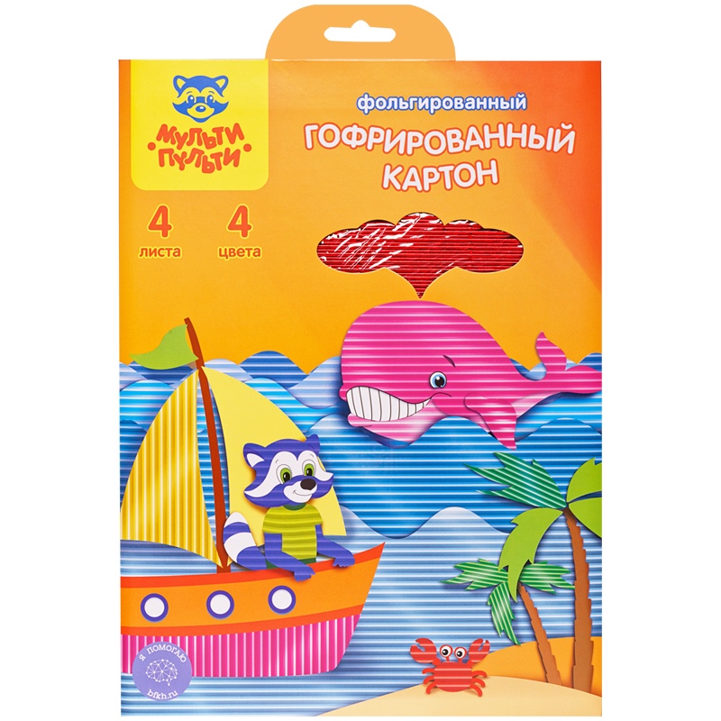 Картон цветной А4, Мульти-Пульти, 4л., 4цв., гофрированный, флуоресцентный, в папке, Приключения Енота (КГф4А4_16862)описаниеГофрированный картон «Мульти-Пульти» является очень удобным материалом для создания детских поделок, аппликаций: он может легко скручиваться и сминаться без дополнительных усилий. Размер: 200*285 мм. Плотность: 170 г/м2. Благодаря своей декоративности и широкому выбору цветов, он используется в различных дизайнерских проектах, при оформлении упаковки и в моделировании. Набор из 5 листов формата А4 разных цветов в папке с замком для удобного хранения и европодвесом. Для детей старше 3-х лет.