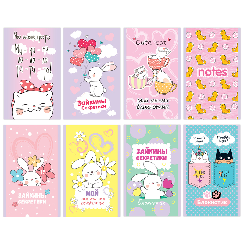 Состоит из 32 листов размером 102*165 мм офсетной бумаги белого цвета плотностью 60 г/м2. Линовка – клетка. Вид крепления – скрепка. Обложка – мелованный картон с блёстками. Милые дизайны с зайками на обложке блокнота поднимут настроение.
