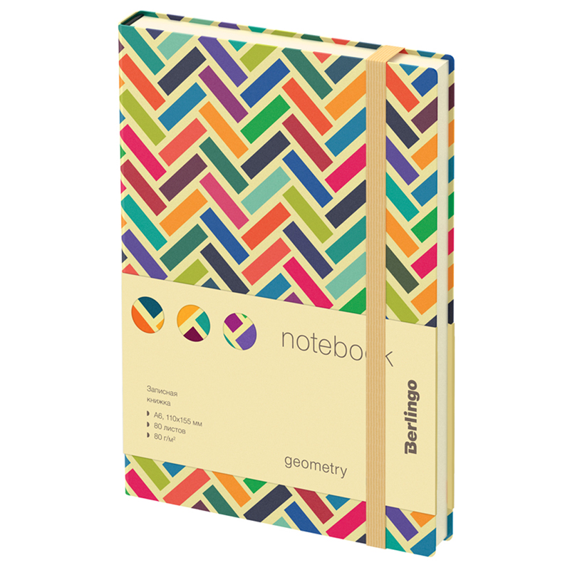 Компактная записная книжка Berlingo Geometry формата А6 с полужесткой обложкой и вертикальной фиксирующей резинкой идеально подойдет для срочных записей и ежедневного использования. Ассорти цветных элементов придает обложке яркий акцент. Прошитый внутренний блок из 80 листов кремовой бумаги повышенной плотности 80 г/м? имеет перфорированные уголки и линовку в клетку. Записная книжка Berlingo Geometry подходит под персонализацию и имеет 2 удобные закладки-ляссе. В подарок – 3 комплекта стикеров с латинским, русским алфавитом и пиктограммами. Записная книжка представлена в размере 110*155 мм. Купите товар «Записная книжка А6 80л., кожзам, Berlingo Geometry , с рисунком (NB0_92602)» по оптовой цене с доставкой или самовывозом.