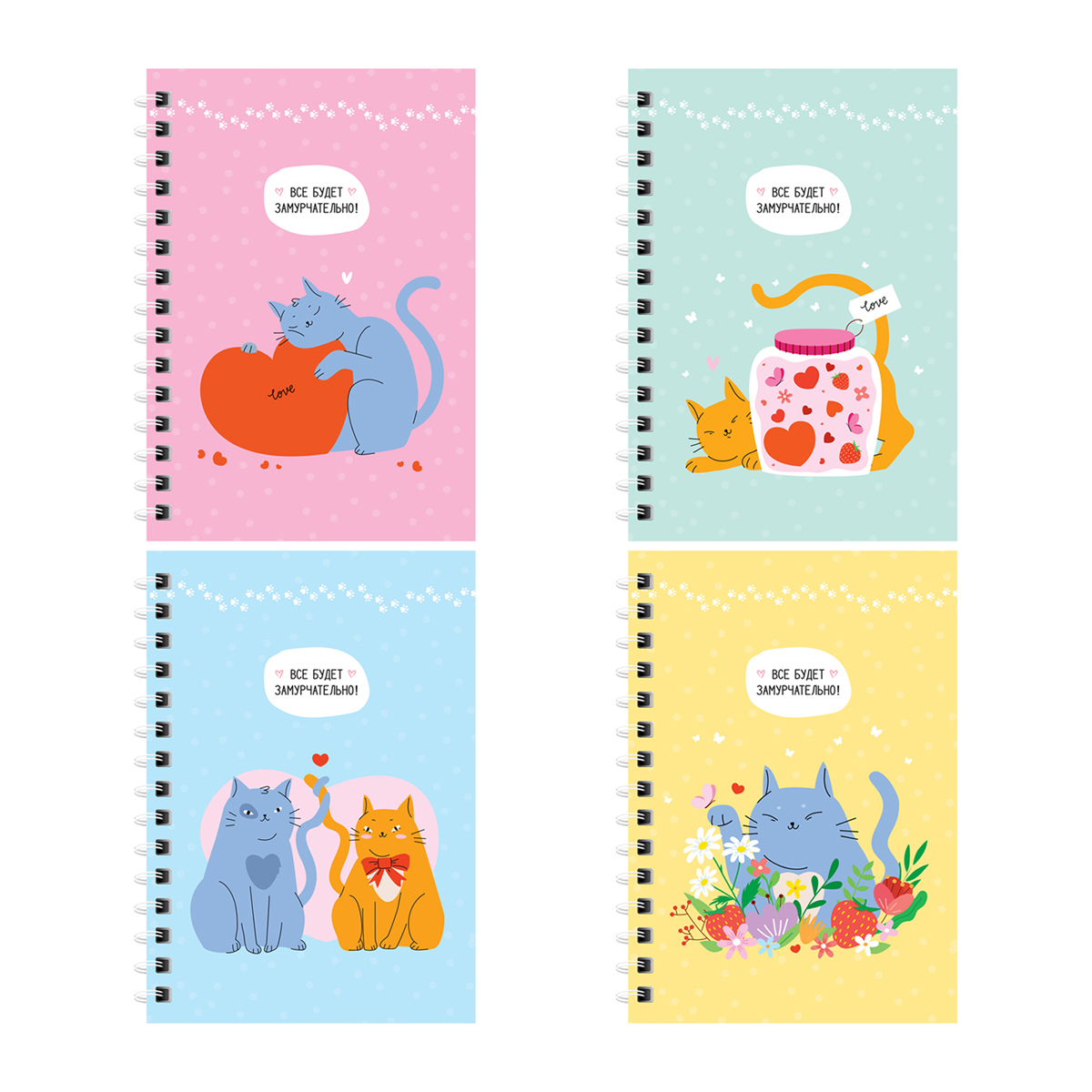 Записная книжка ArtSpace «Замурчательная история» формата А6 на гребне – лучший друг для записи важных мыслей и дел. Внутренний блок плотностью 60г/м? состоит из 120 листов офсетной бумаги белого цвета с линовкой в клетку. Записная книжка представлена в размере 100*145 мм. Обложка изготовлена из твёрдого прочного картона с матовой ламинацией.