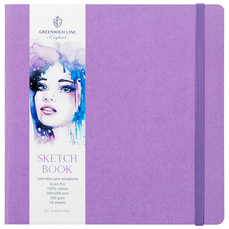 Скетчбук для акварели Greenwich Line состоит из 18 листов плотностью 200 г/м2, тип скрепления – сшивка. Внутренний блок - 100% хлопок с двумя типами поверхности (гладкая, лёгкое зерно). Удобный размер 200*200 мм позволяет взять скетчбук с собой и делать зарисовки на улице и в путешествии. Квадратный формат является оптимальным для творчества, так как симметричные композиции на нем смотрятся гораздо интереснее и гармоничнее. Мягкая обложка из дизайнерского картона сиреневого цвета фиксируется резинкой в тон.